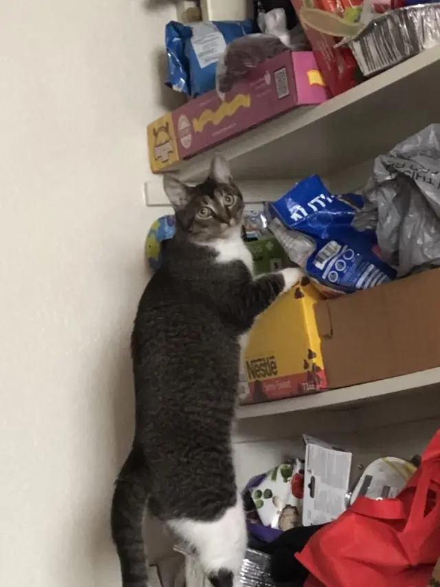 8. Sudah lapar, kucing ini mencari di tumpukan stok makanan yang belum dibuka